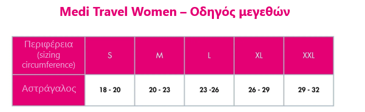 Η medi travel women είναι μια σπορ κάλτσα ταξιδιού. Σε μεγαλύτερα ταξίδια, συμβάλλει σε ευχάριστα ανάλαφρα και χαλαρά πόδια. Η κάλτσα ταξιδιού κάτω από το γόνατο αποτελείται από ιδιαίτερα μαλακό, αντιστατικό υλικό με ενισχυμένη σόλα - για υψηλή άνεση στη χρήση και εύκολη εφαρμογή και αφαίρεση.